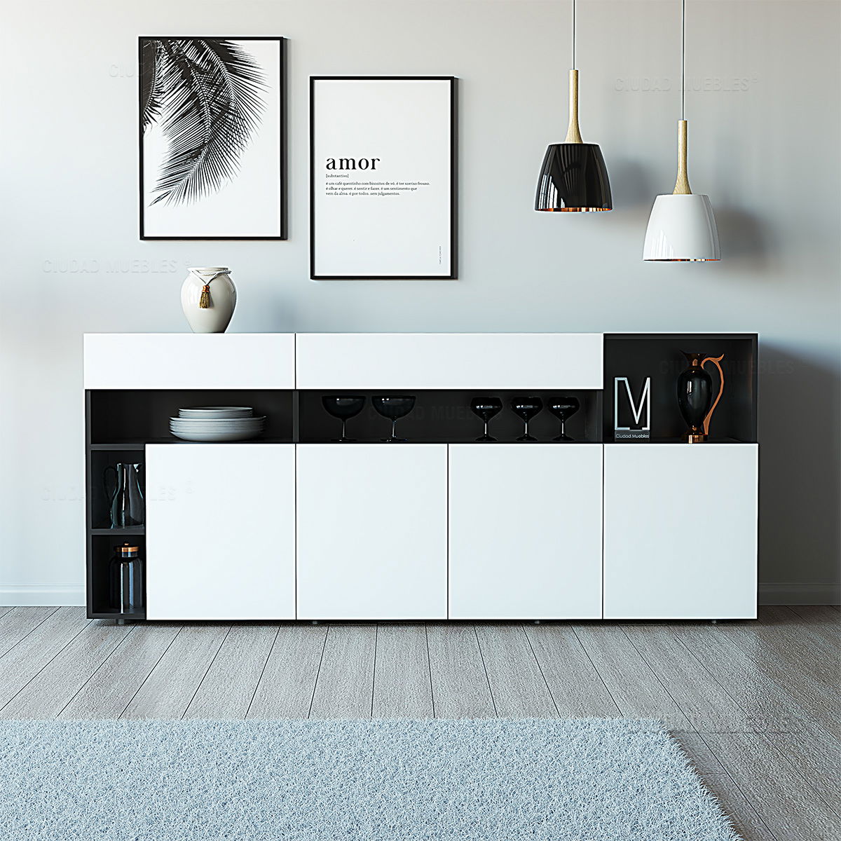 Se destaca por su diseño simple y el juego entre los llenos y vacíos Se utilizan materiales de primera calidad, garantizando una larga vida útil al mueble. Revestido en melamina en todo su interior con bisagras y correderas metálicas en cajones.