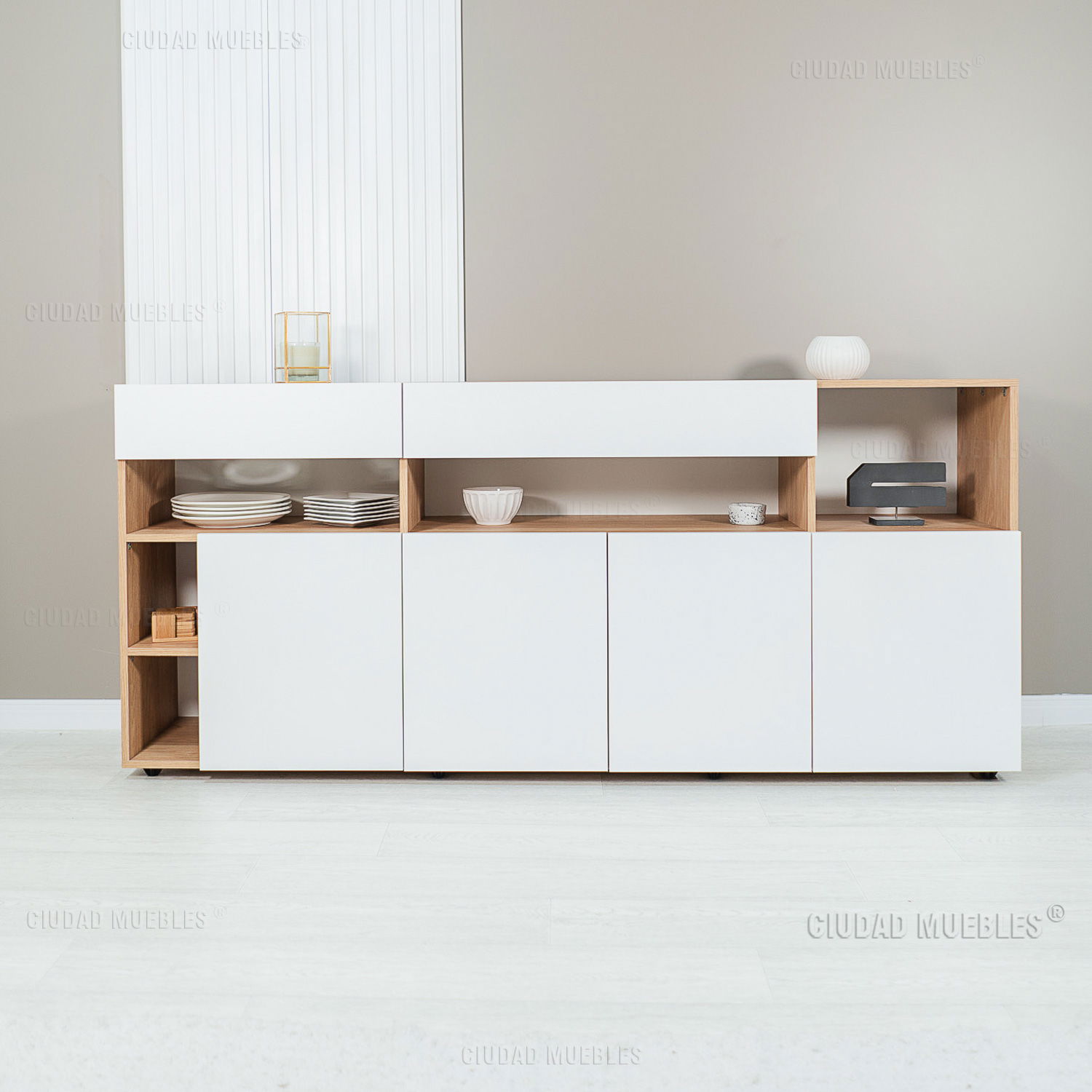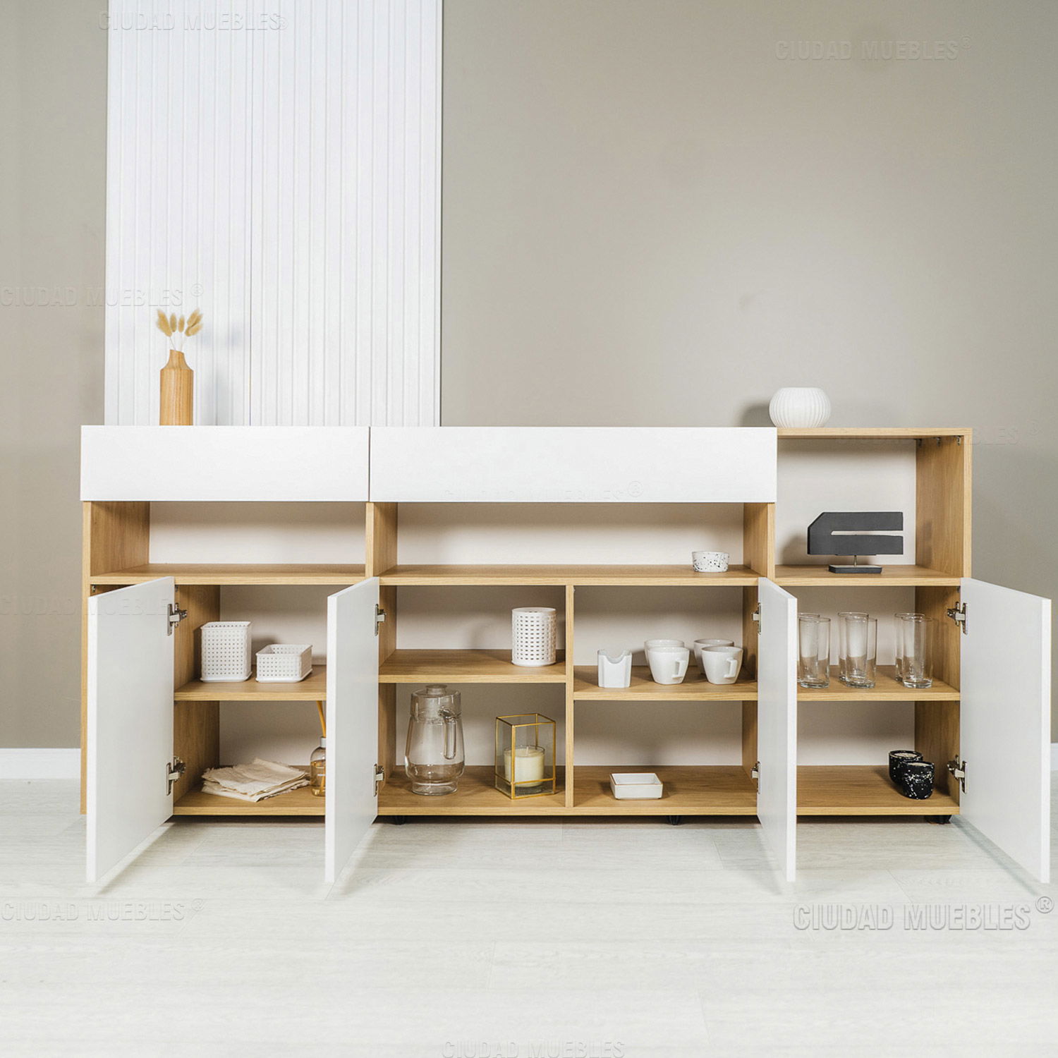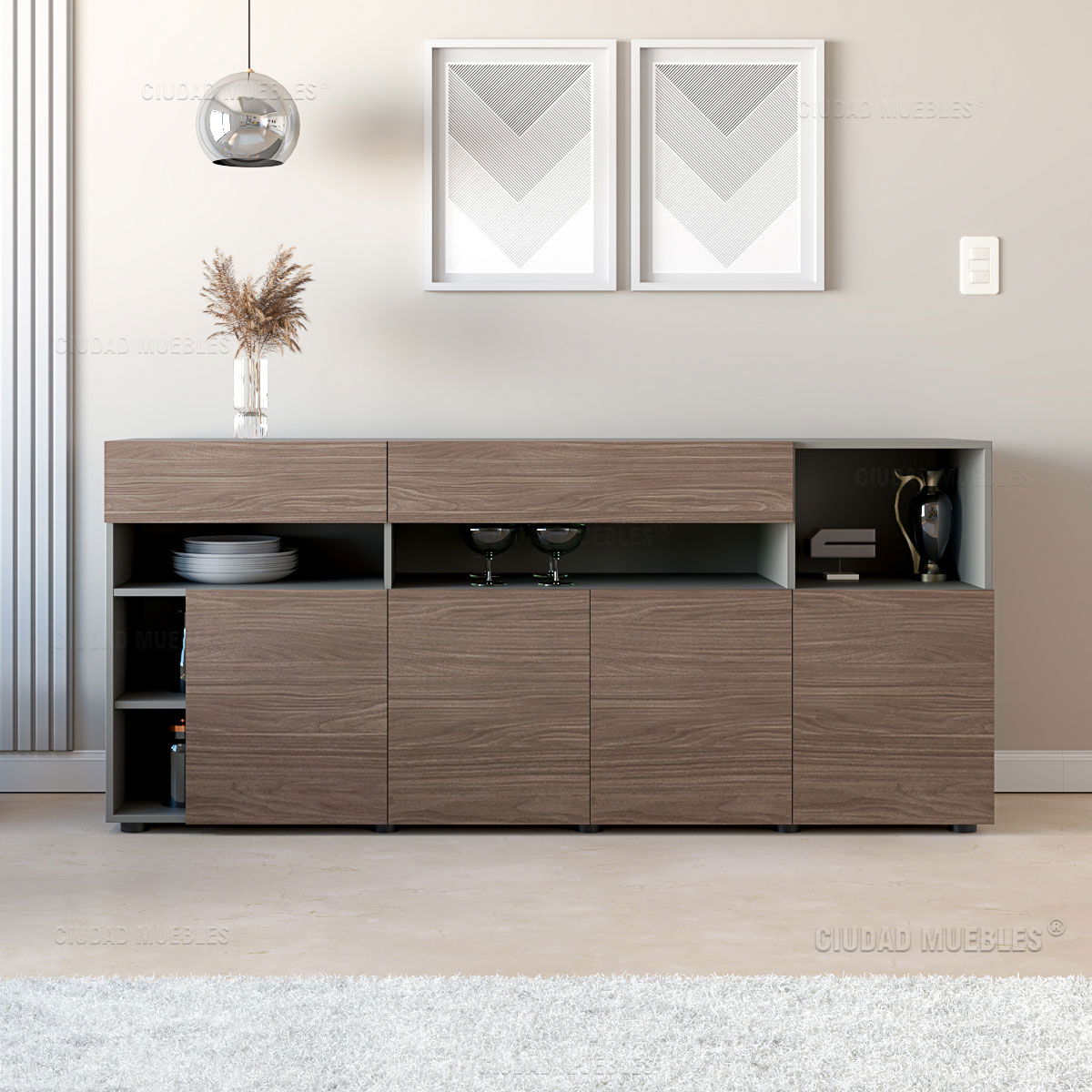 Se destaca por su diseño simple y el juego entre los llenos y vacíos Se utilizan materiales de primera calidad, garantizando una larga vida útil al mueble. Revestido en melamina en todo su interior con bisagras y correderas metálicas en cajones.