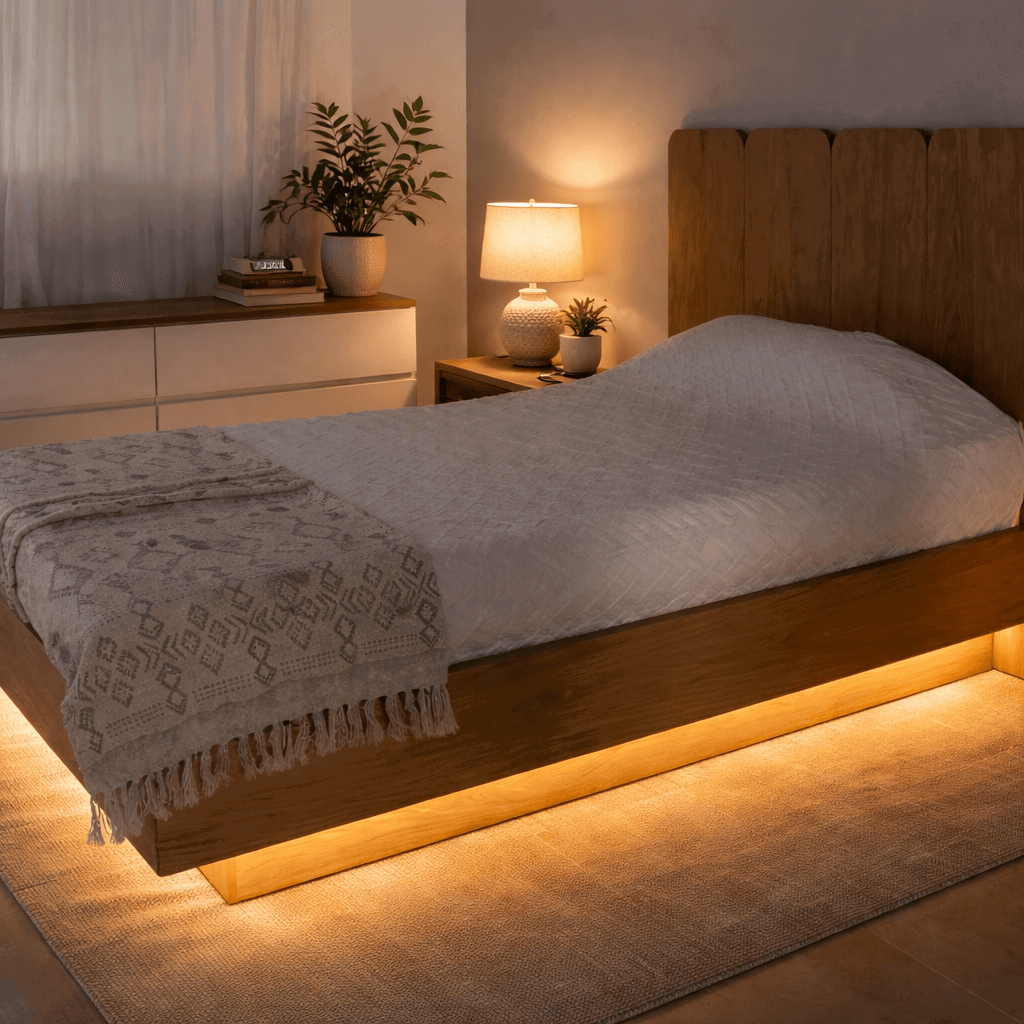 También podés optar por nuestro sistema de iluminación LED: con una densidad superior de 60 luces por metro, crea una atmósfera envolvente que resalta el efecto flotante del mueble, convirtiendo tu habitación en un espacio de diseño tecnológico y relajante.