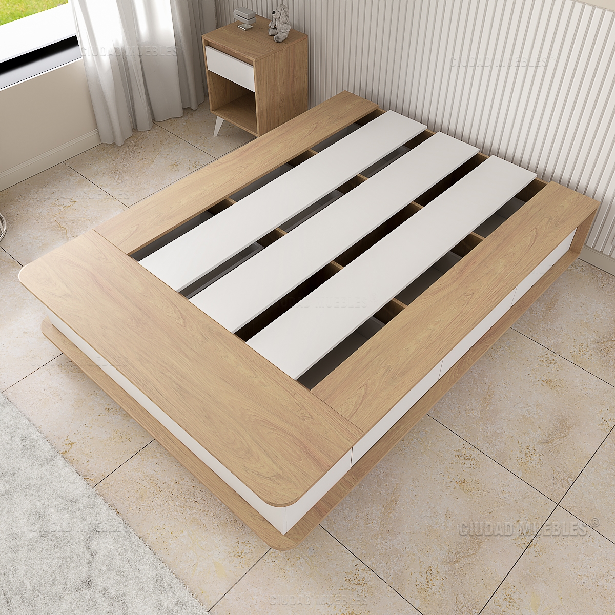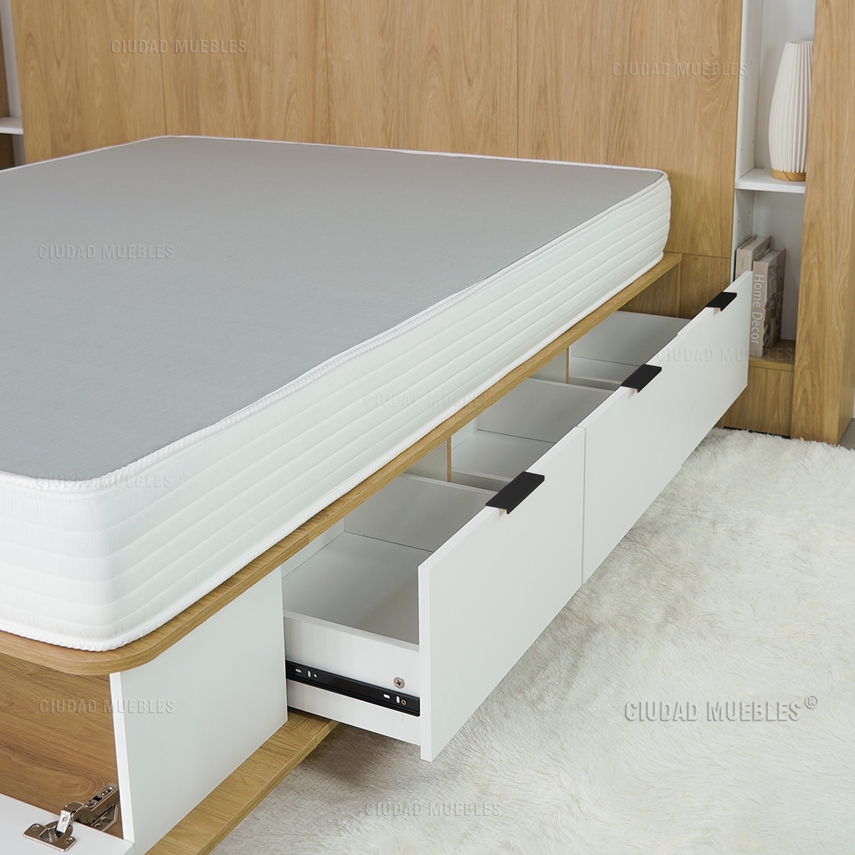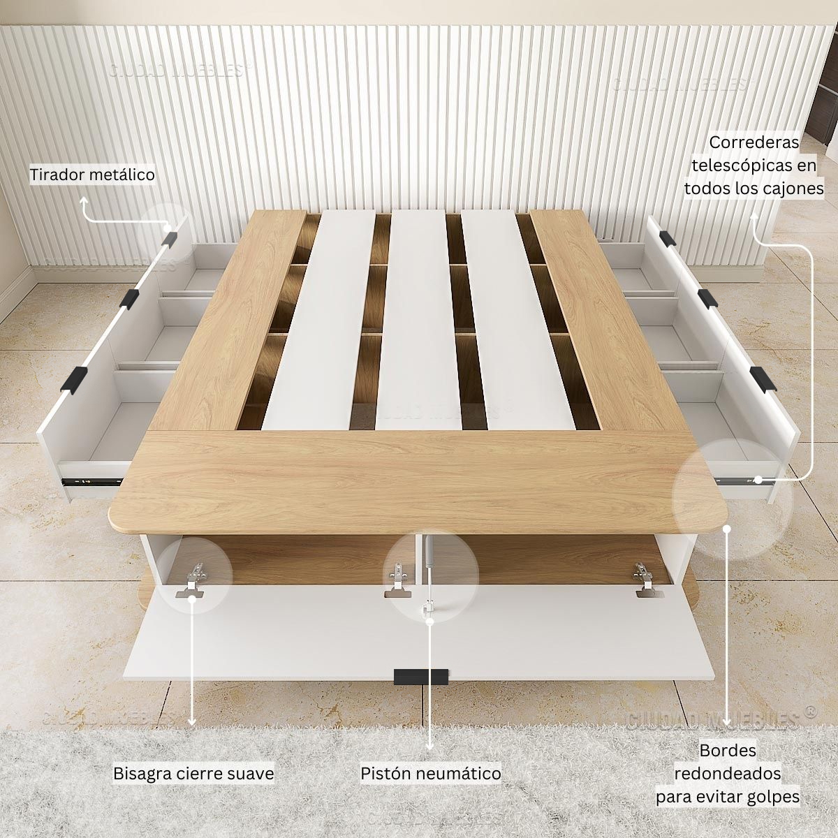 Cuenta con seis amplios cajones laterales y dos bauleras frontales, perfectas para guardar ropa de cama, calzado y objetos de uso diario. Sus esquinas redondeadas y el zócalo retirado aportan mayor seguridad y comodidad en el uso cotidiano.