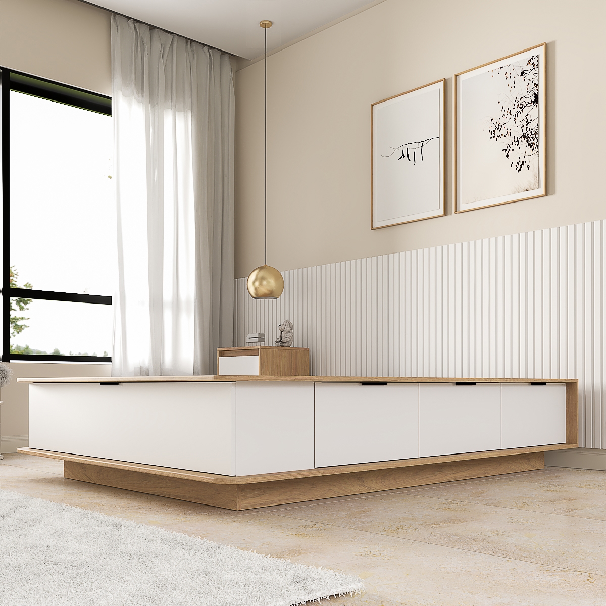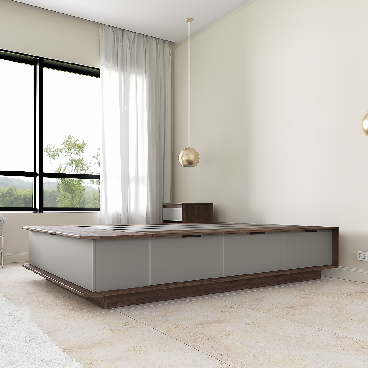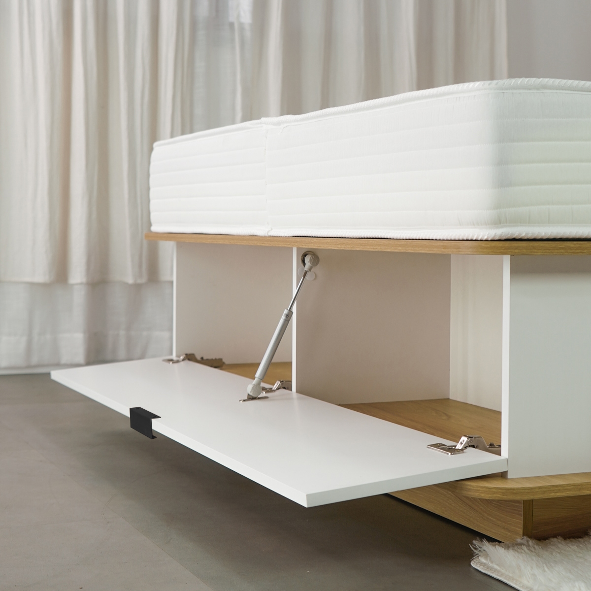 Cuenta con seis amplios cajones laterales y dos bauleras frontales, perfectas para guardar ropa de cama, calzado y objetos de uso diario. Sus esquinas redondeadas y el zócalo retirado aportan mayor seguridad y comodidad en el uso cotidiano.