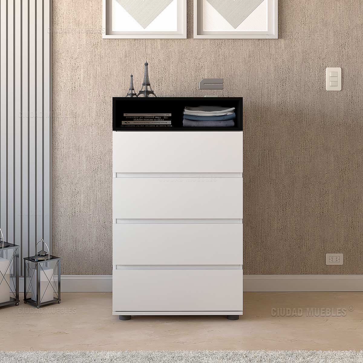 Equipado con 4 amplios cajones de guardado y estante superior funcional.