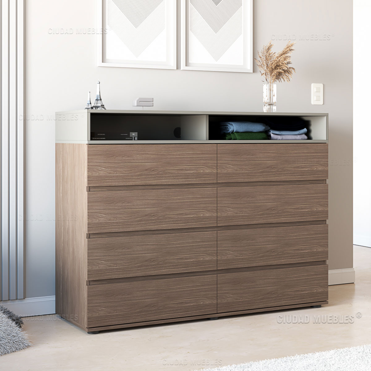 La Cómoda con 8 Cajones y Estante combina gran capacidad de guardado y funcionalidad inteligente. Cuenta con amplios cajones con correderas telescópicas para una apertura suave y cómoda, ideales para organizar ropa y accesorios. Su estante superior abierto mantiene todo al alcance, y gracias a su estructura resistente también es apta para colocar una TV, convirtiéndola en una solución versátil para dormitorio.