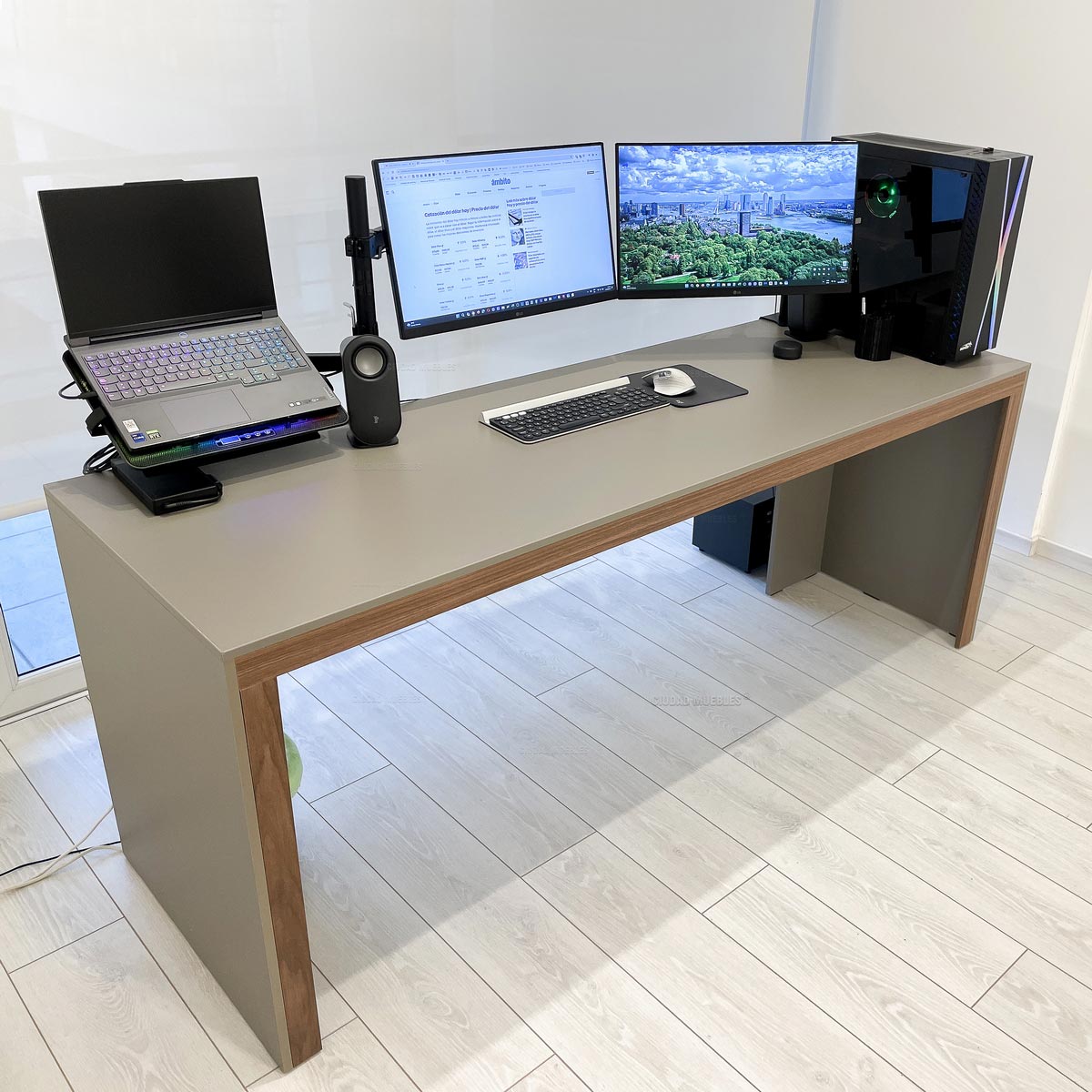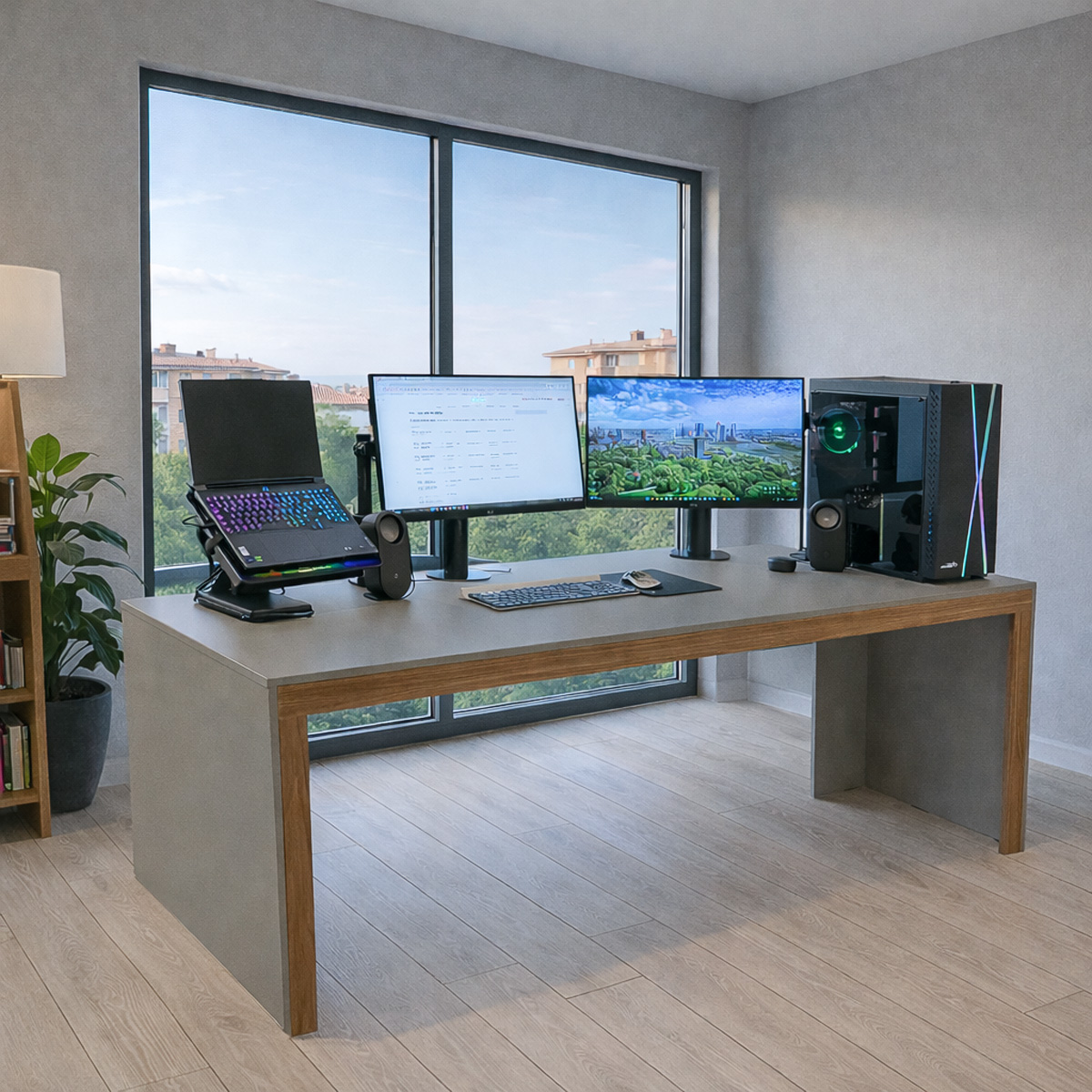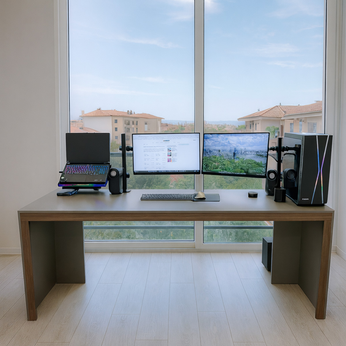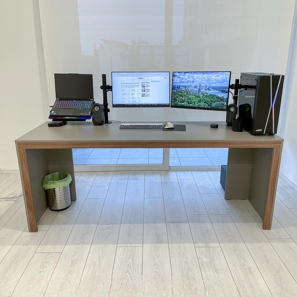 La base de operaciones que tu setup merece.Superficie amplia para múltiples monitores y periféricos, con borde frontal en canto de PVC para mayor comodidad.Estructura reforzada con faja trasera y listón frontal que asegura estabilidad total.