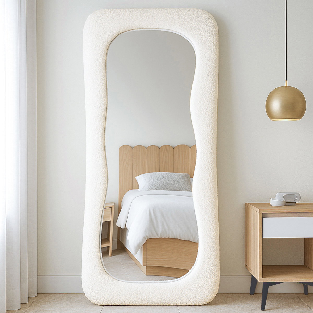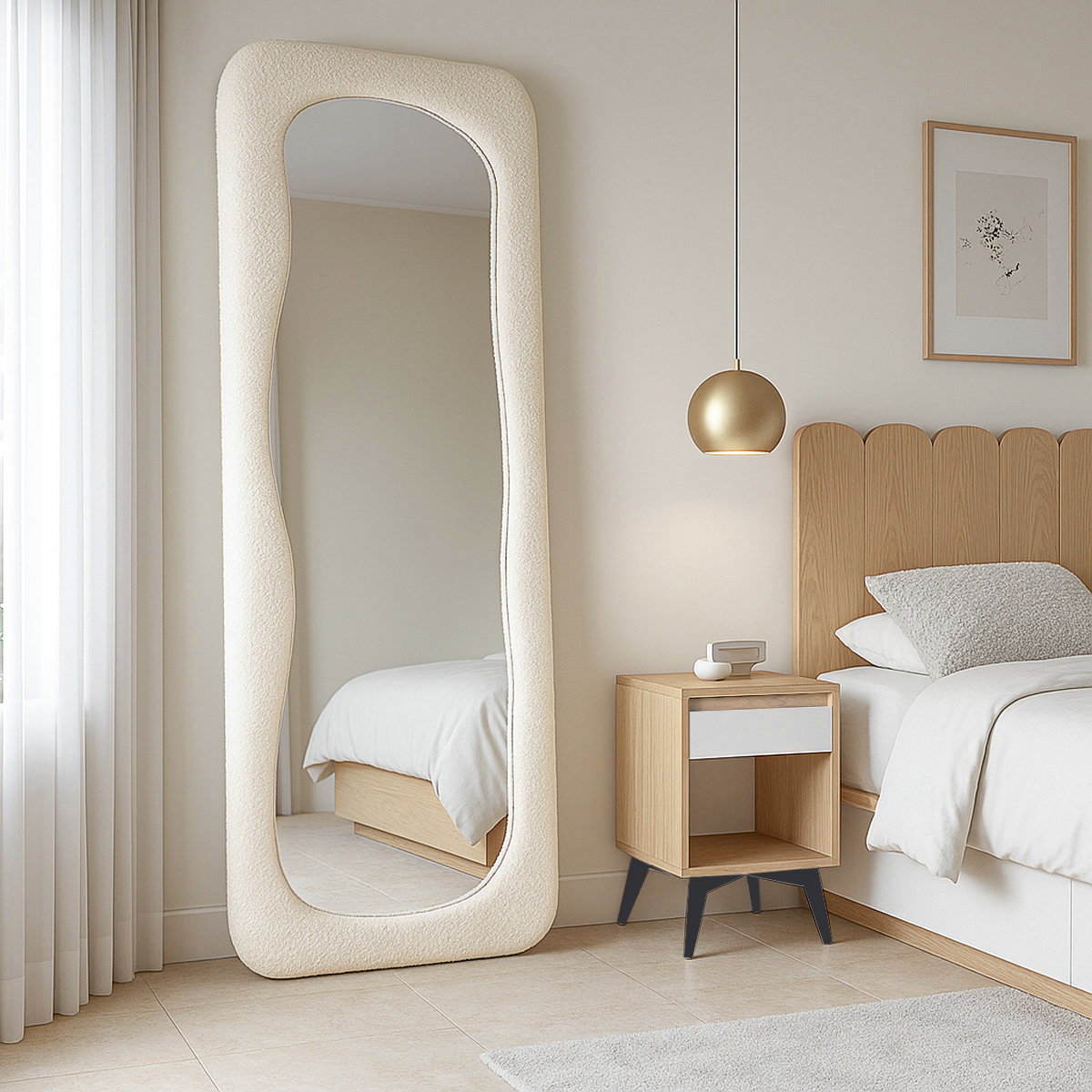 Pieza de diseño moderno y textil que fusiona el estilo contemporáneo con la calidez de los materiales suaves. Ideal para quienes buscan un espejo de cuerpo entero con personalidad, elegancia y un acabado premium.