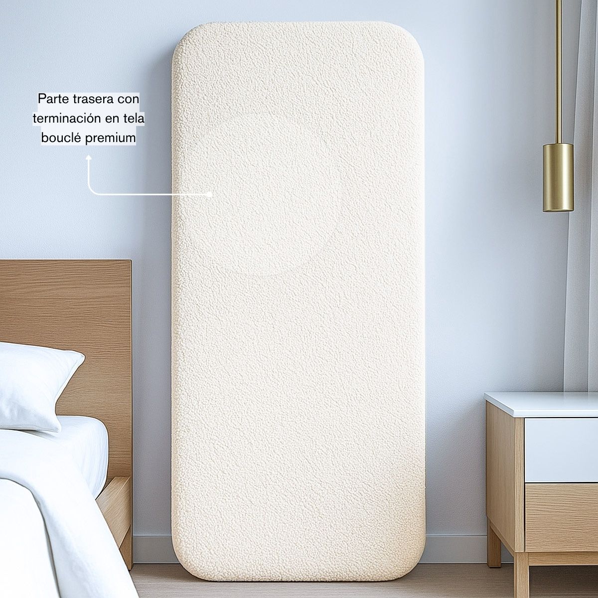 El Espejo de Bouclé Premium destaca por su formato rectangular de bordes ondulados y su marco tapizado en tela bouclé beige, que aporta textura, suavidad y un aire sofisticado.