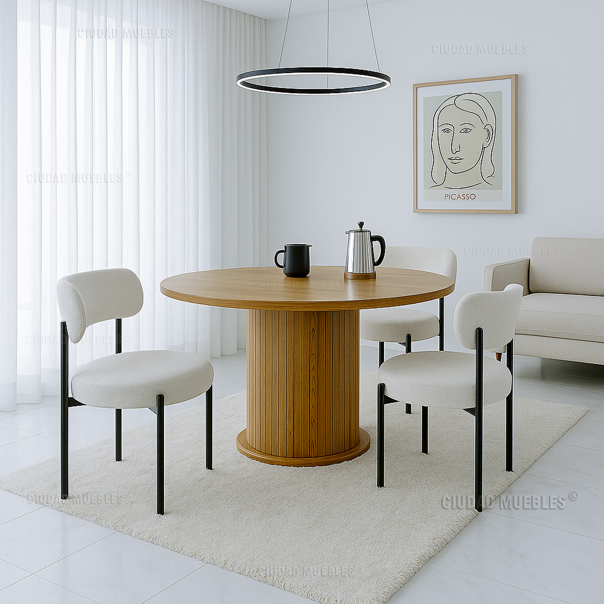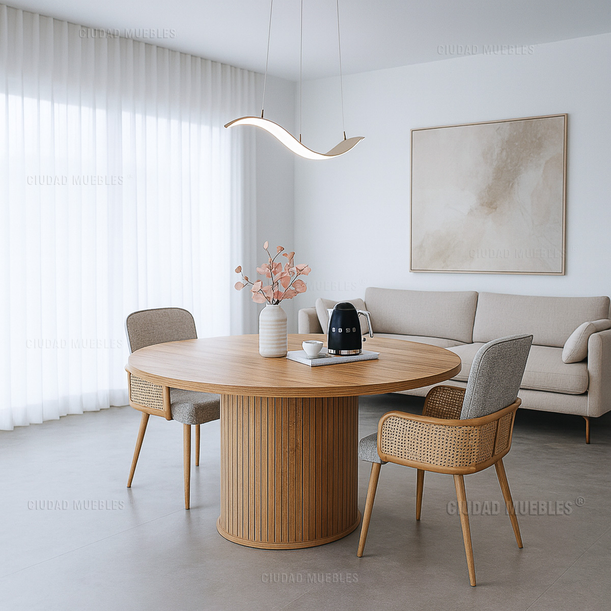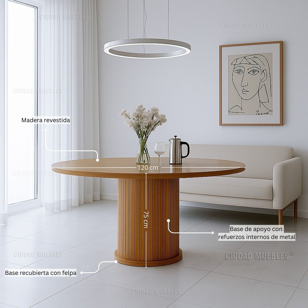 Su base central acanalada es una obra de arte que aporta estabilidad y carácter único. Con 120 cm de diámetro, esta mesa redonda elimina cabeceras para que las charlas fluyan en un ambiente acogedor. Incluye felpa protectora para cuidar tus pisos y es ideal para combinar con 4 a 6 sillas. El centro de atención perfecto que se convertirá en el corazón de tu hogar. Diseño escultural para encuentros memorables.