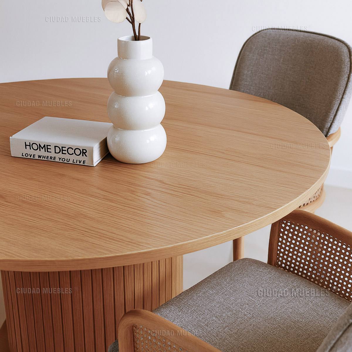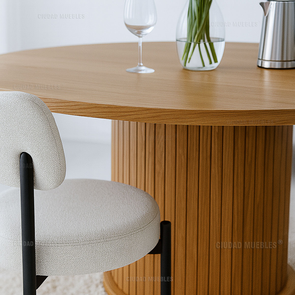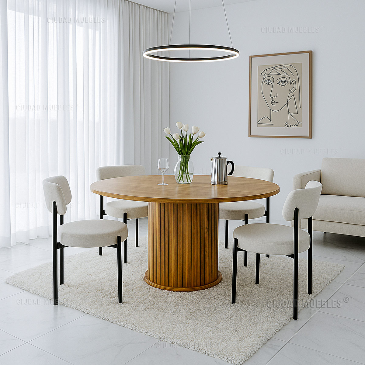Su base central acanalada es una obra de arte que aporta estabilidad y carácter único. Con 120 cm de diámetro, esta mesa redonda elimina cabeceras para que las charlas fluyan en un ambiente acogedor. Incluye felpa protectora para cuidar tus pisos y es ideal para combinar con 4 a 6 sillas. El centro de atención perfecto que se convertirá en el corazón de tu hogar. Diseño escultural para encuentros memorables.