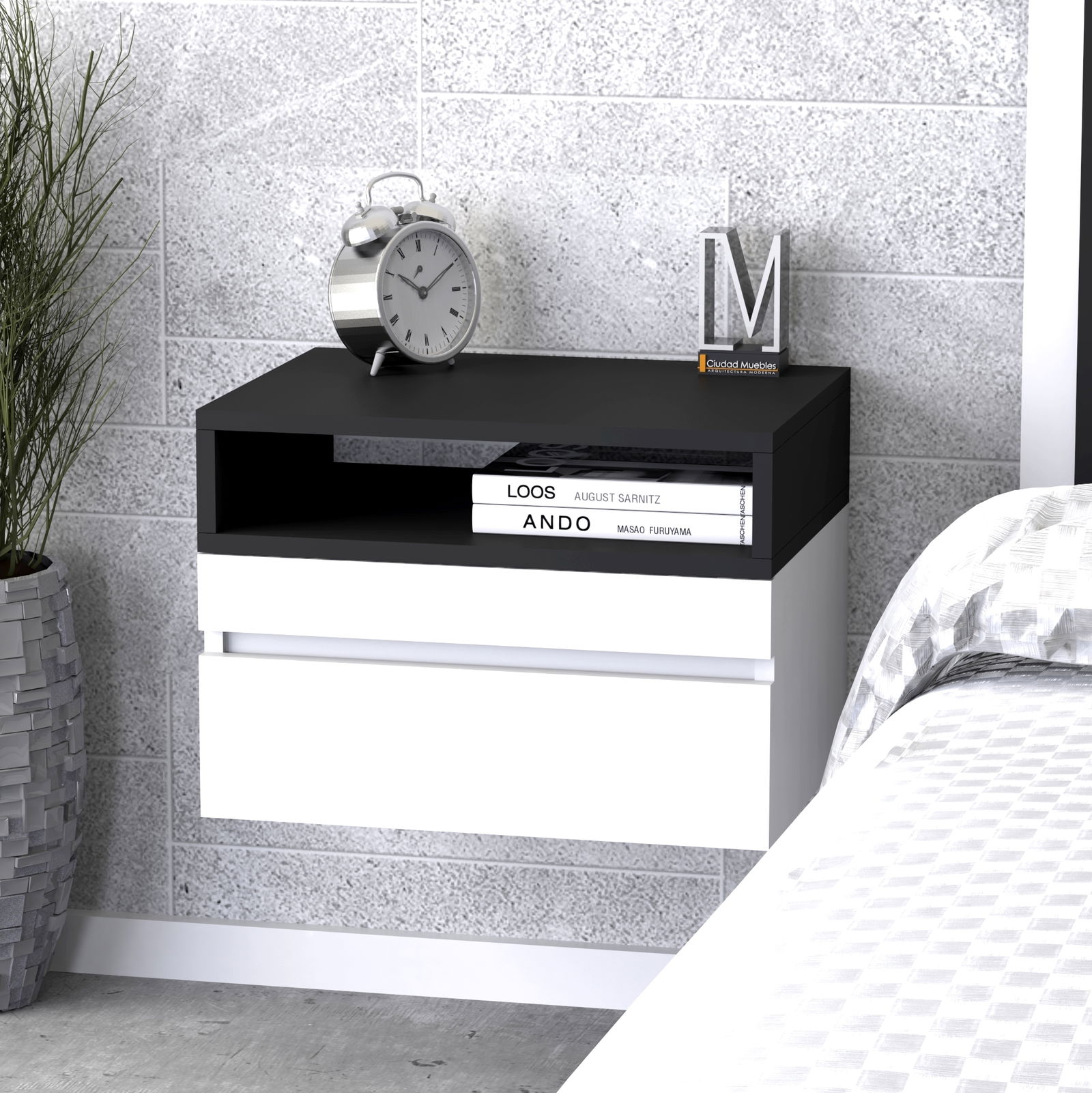 La Mesa de Luz Flotante con Bandeja ofrece organización triple: un cajón cerrado para guardar lo personal, un estante abierto para lo esencial y una bandeja superior como apoyo extra.