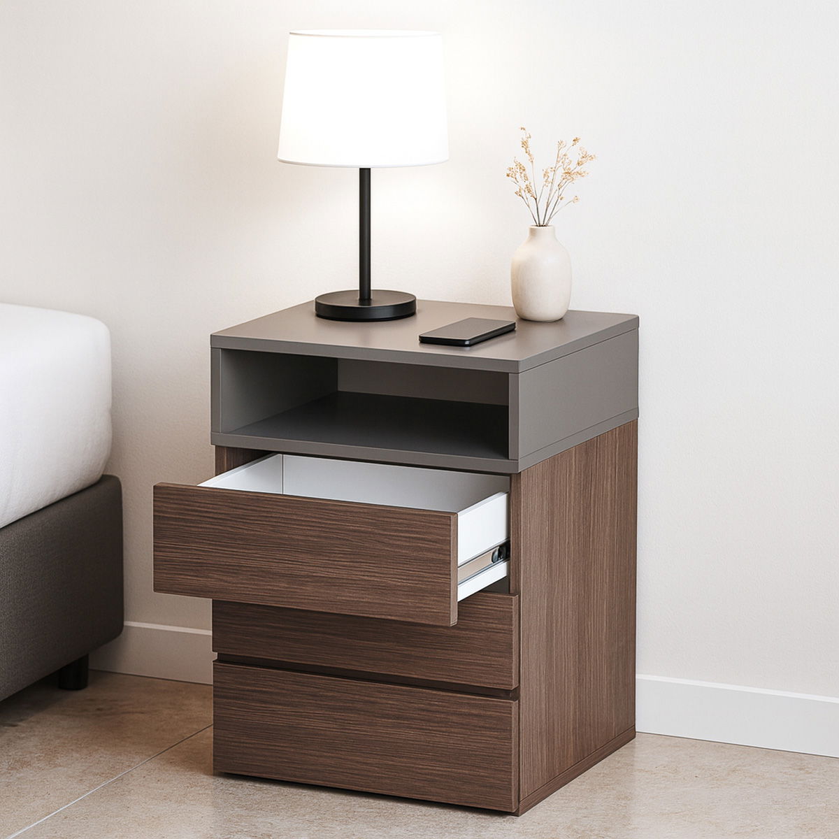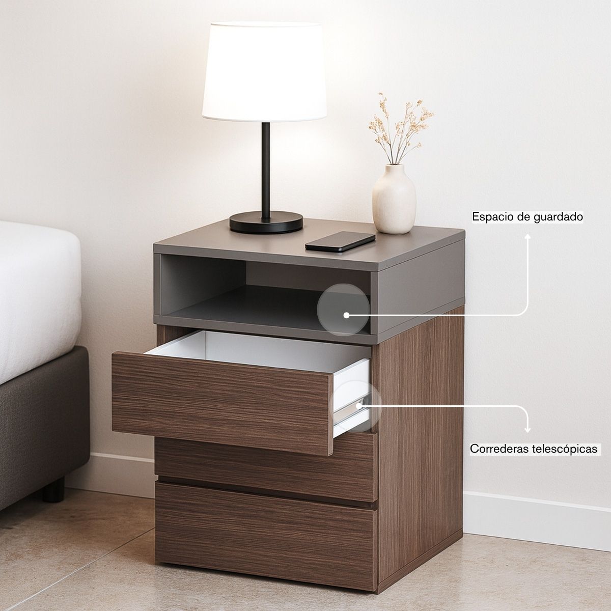 Mesa de luz cajones y estante: Cuenta con 3 cajones amplios y 1 estante en la parte superior, donde podés colocar distintos tipos de objetos.