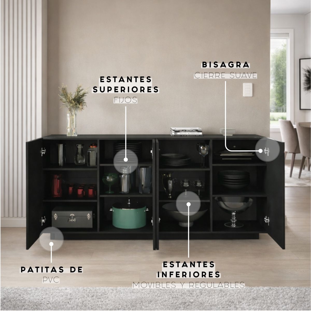 Vajillero aparador de 180cm con diseño moderno y gran capacidad de guardado. Cuenta con cuatro puertas y estantes interiores, ideal para organizar vajilla y objetos en livings o comedores. Fabricado con materiales resistentes y estética minimalista.