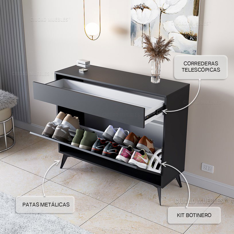 Guardá tu calzado (hasta talle 45) de forma oculta y prolija. Su diseño inteligente maximiza el espacio sin ocupar mucho lugar, mientras que el cajón con correderas telescópicas es ideal para dejar llaves y accesorios al entrar.