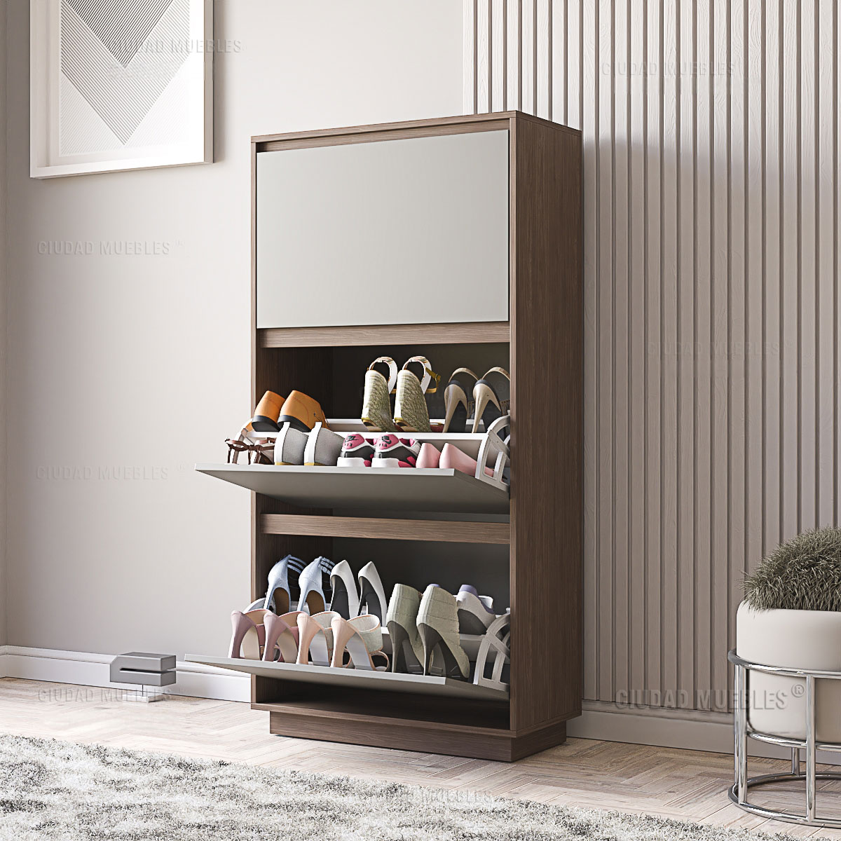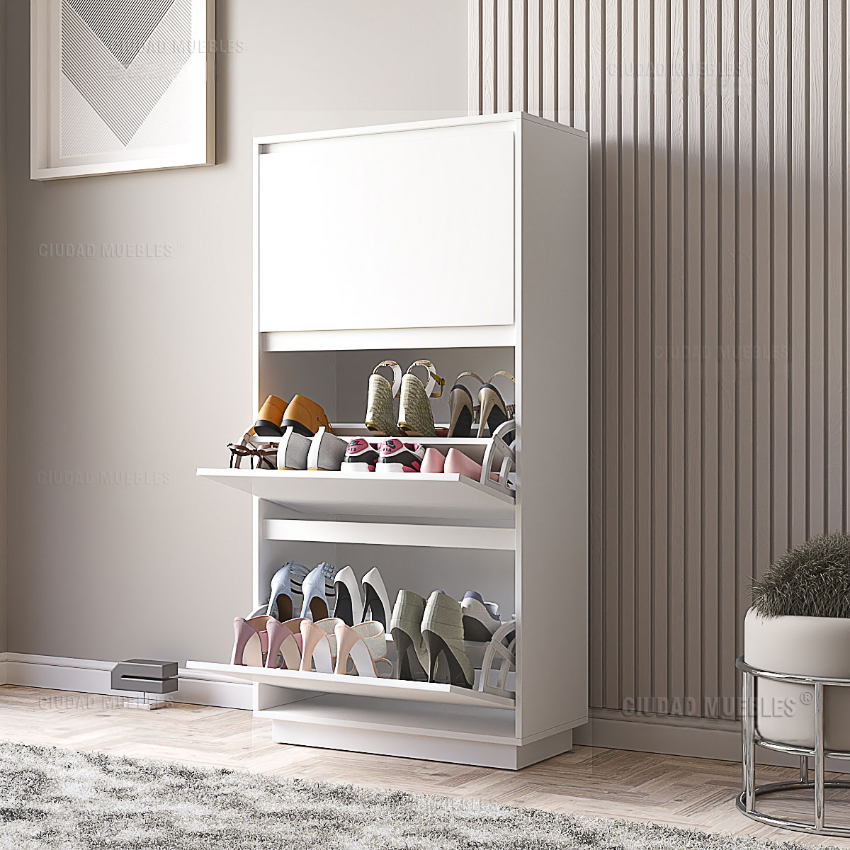 Su sistema interior optimiza cada centímetro para que guardes hasta 20 pares de zapatos (talle 45 inclusive). Tu calzado queda protegido, ordenado y siempre fuera de la vista.